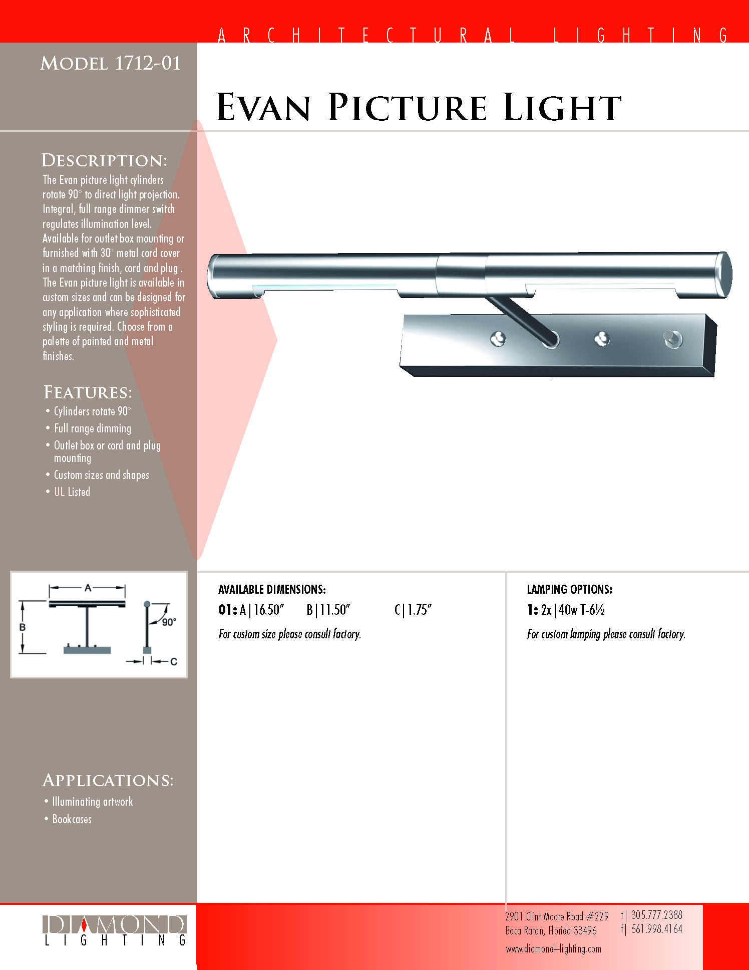 The Evan picture light cylinders rotate 90° to direct light projection. Integral, full range dimmer switch regulates illumination level. Available for outlet box mounting or furnished with 30" metal cord cover in a matching finish, cord and plug. The Evan picture light is available in custom sizes and can be designed for any application where sophisticated styling is required. Choose from a palette of painted and metal finishes.