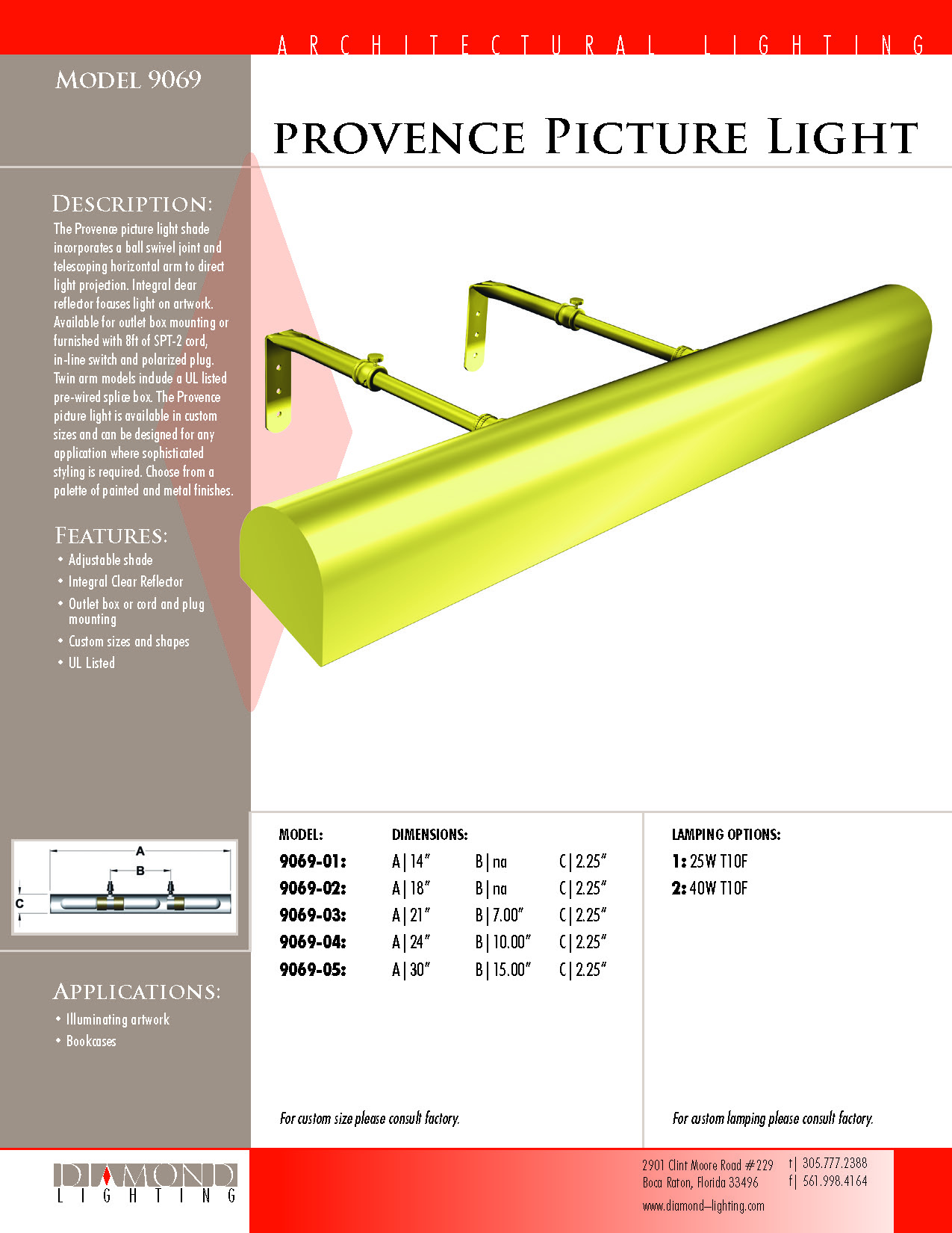 The Provence picture light shade incorporates a ball swivel joint and telescoping horizontal arm to direct light projection. Integral clear reflector focuses light on artwork. Available for outlet box mounting or furnished with 8ft of SPT-2 cord, in-line switch and polarized plug. Twin arm models include a UL listed pre-wired splice box. The Provence picture light is available in custom sizes and can be designed for any appication where sophisticated styling is required. Choose from a palette of painted and metal finishes.