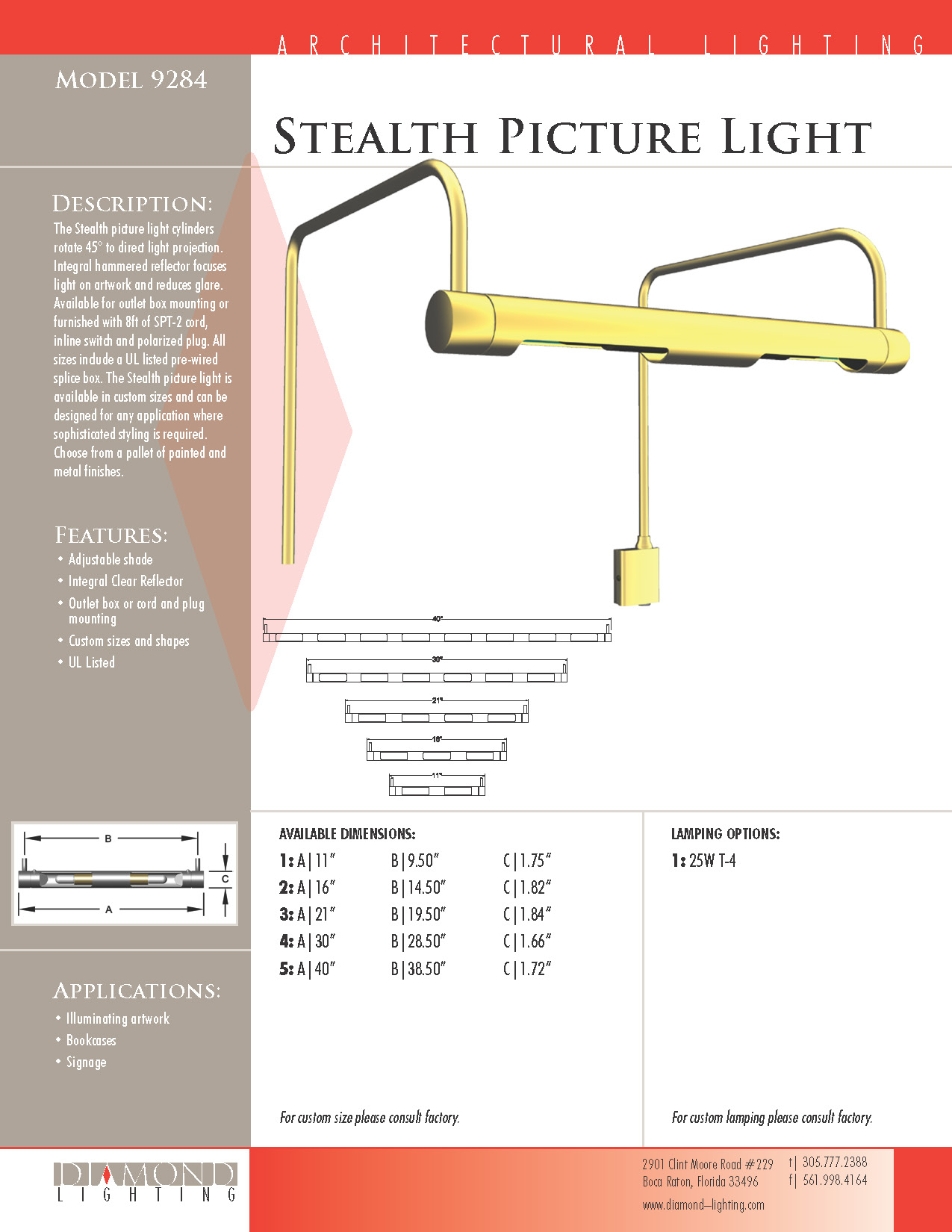 The Stealth picture light's cylinders rotate 45° to direct light projection. Integral hammered reflector focuses light on artwork and reduces glare. Available for outlet box mounting or furnished with 8ft or SPT-2 cord, inline switch and polarized plug. All sizes include a UL listed pre-wired splice box. The Stealth picture light is available in custom sizes and can be designed for any appication where sophisticated styling is required. Choose from a palette of painted and metal finishes.